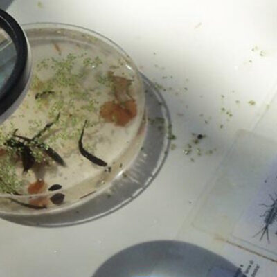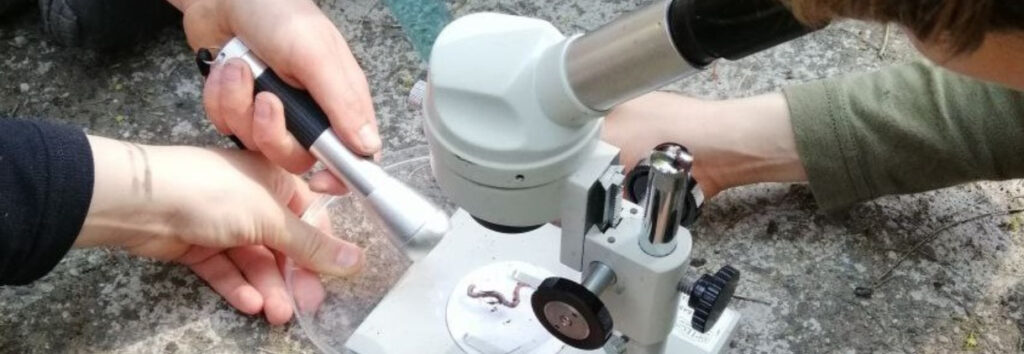Esplorazione scientifica con stereoscopi, chiavi dicotomiche e taccuino di osservazione delle specie.