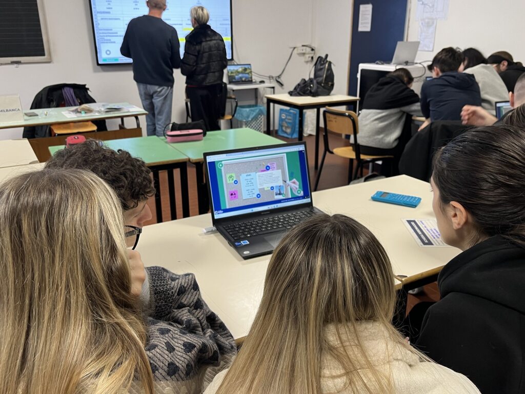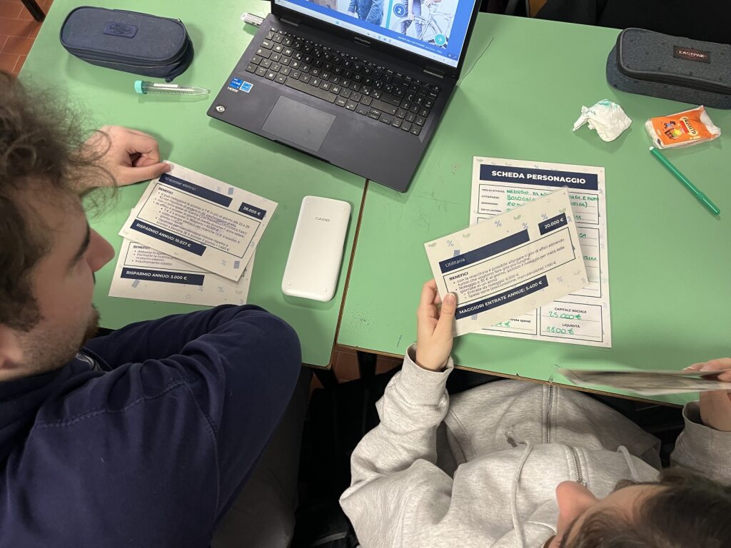 Il cuore del laboratorio è un gioco di ruolo educativo, che favorisce l’apprendimento attivo e il coinvolgimento diretto degli studenti. I ragazzi e le ragazze si immedesimano nei titolari di una piccola azienda, con l’obiettivo di far crescere la propria attività. A un certo punto del percorso, infatti, devono affrontare una scelta strategica: investire e nel modo più sostenibile possibile.